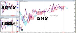 このことから上位足(4時間足、1時間足)は、上に行くのか下に行くのかわからない相場です。