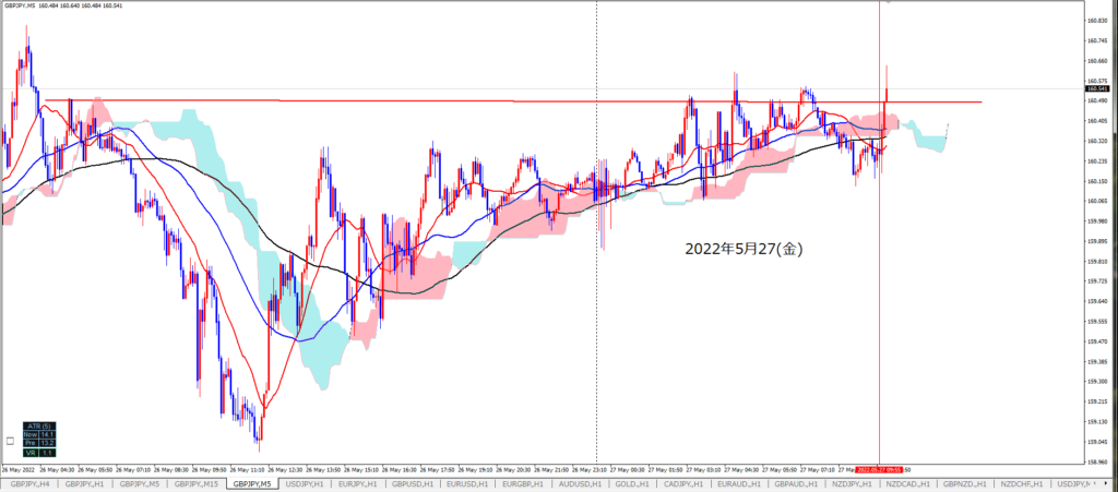 5分足で前回下降したところに水平線(トレンドライン機能で水平線)を引きます。